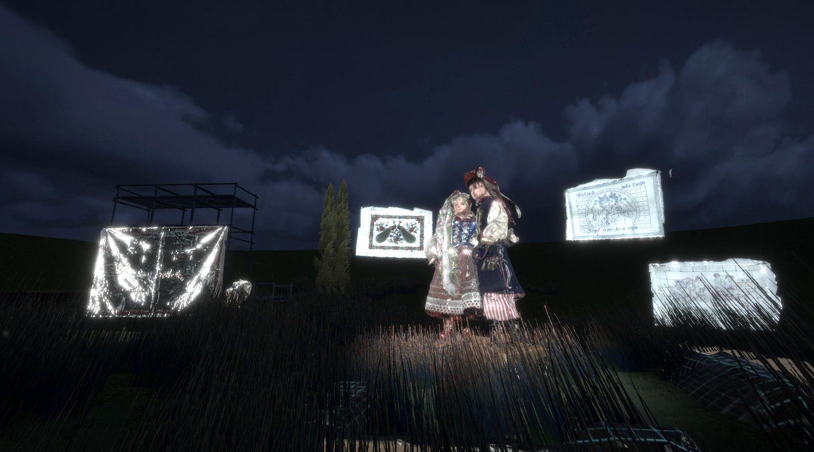 Based on an extensive collection of embroidered textiles of the Museum of Brodsko Posavlje, artists created a series of embroidered “zidnjaci” adapted for contemporary times, presented as textile artworks and 3D models, embedded within virtual space resembling a video game. While retaining the traditional format of text and images placed on fabric, analogue mediums of embroidering were intertwined with digital production techniques and the outcome of AI generators. Digitally modified scanned shapes of original “zidnjaci” were combined with newly created sayings, generated by an autoregressive language model GPT-3 that uses deep learning to produce human-like text. Generated texts consist of the most common terms we were exposed to during the pandemic. Reflecting the pandemic reality, heavily reduced to virtual representation, “new-normal” sayings replace questionable traditional proverbs and establish yet another layer of everyday life saturated with stereotypes and misinformation.